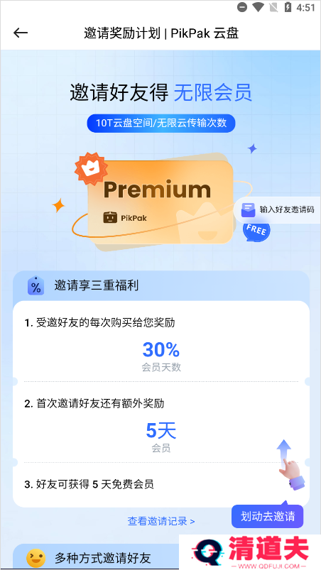 7、另外,如果你想要免费享受pikpak会员服务,还可邀请好友免费领取。