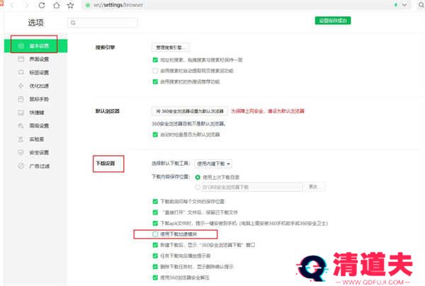 4、在选项中找到【基本设置】板块,之后在【下载设置】板块当中,将”使用下载加速模板“勾选去除。