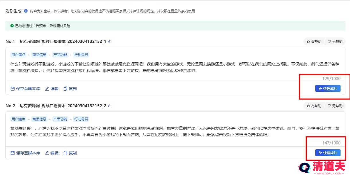 5、这样就可以生成一段视频的脚本了,然后点击自己喜欢的一段口播脚本,点击【快速成片】。