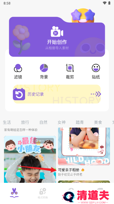 1、下载软件打开首页,下滑找到可爱亲子相册