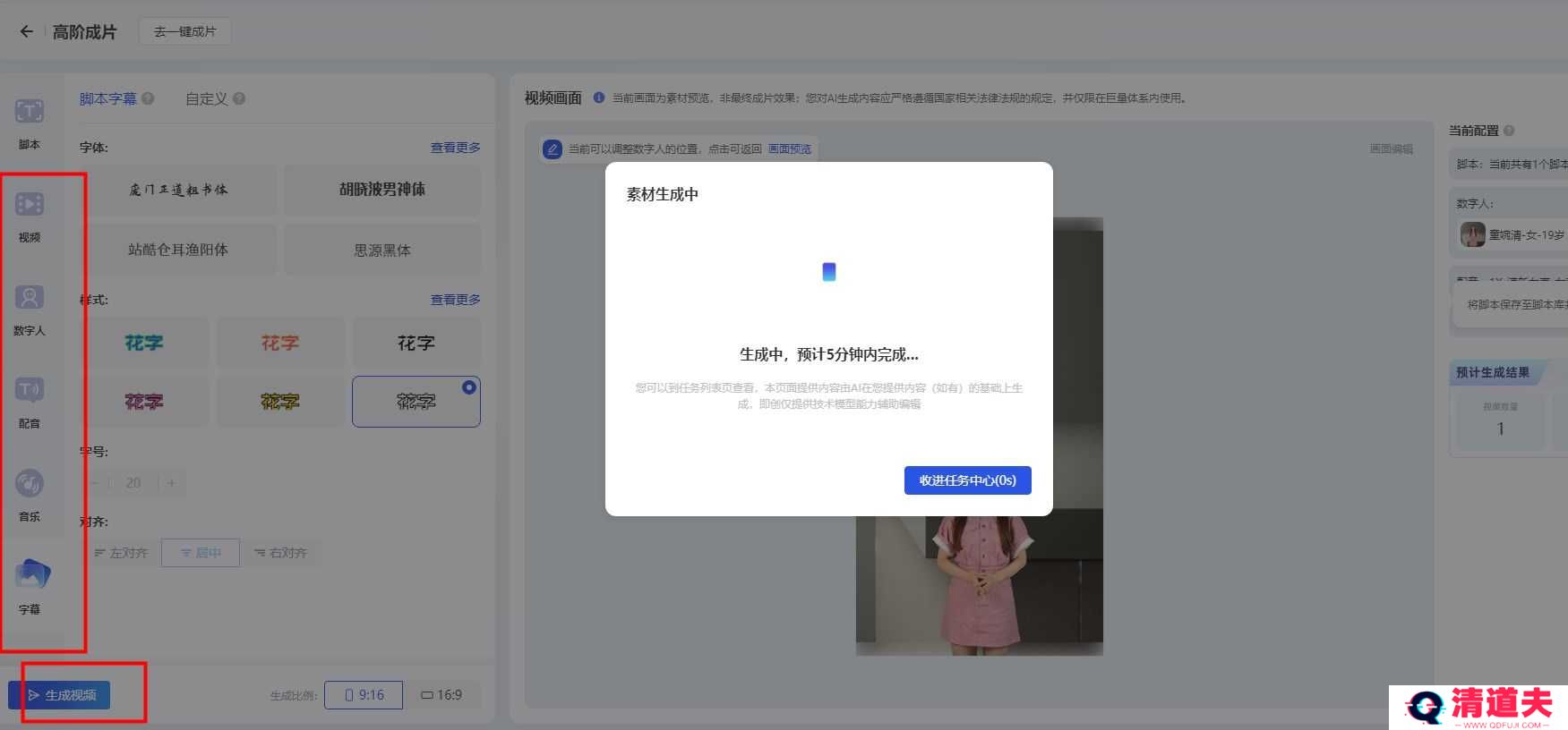 6、然后选择视频、数字人、配音、音乐、字幕即可,还可以上传自己的视频加入哦,全部填写完成后点击【生成视频】即可。