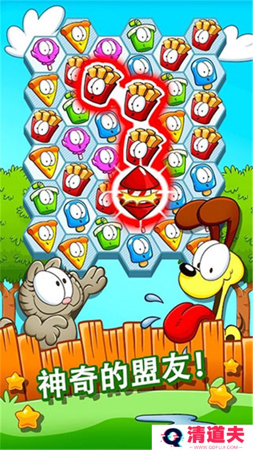 1、玩家可以在游戏中遇到加菲猫的小伙伴,如欧迪、乔恩等,一起完成消除任务,获得美食。