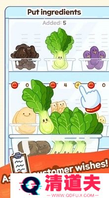 1、玩家作为老板每天都要购买新鲜的食材,根据顾客选择的食材进行烹饪,并给到顾客获得盈利;