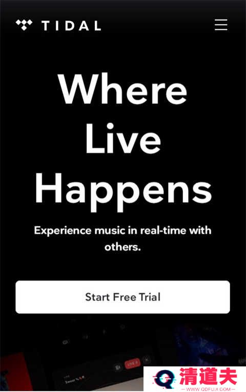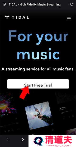 如果没有tidal账号需要先至官网(tidal.com)注册tidal账号,来到官网后点击startfreetrial按钮(注意:注册过程中需要使用魔法)