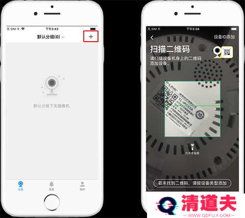 复位摄像头,使其指示灯变为红绿交替闪烁。登录TP-LINK安防APP,点击设备主界面右上角【+】,扫描摄像头背面的二维码: