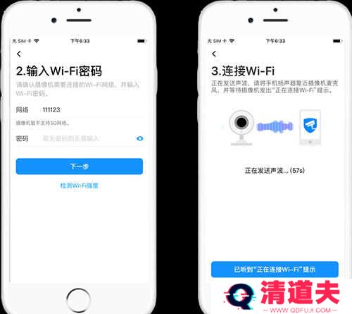 扫码成功后,按照向导输入Wi-Fi密码进行声波配置,配置完成后即可在设备列表查看摄像头;