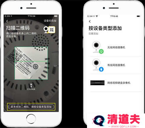 对于一些没有二维码或不方便扫描二维码的无线摄像头可按设备类型添加。在扫描二维码的下方点击按设备类型添加,选择【无线网络摄像机】进行配置