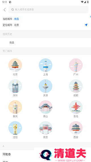 2、点击上方的城市,然后选择定位自己所在的城市