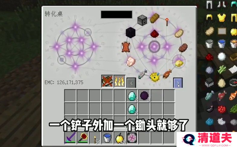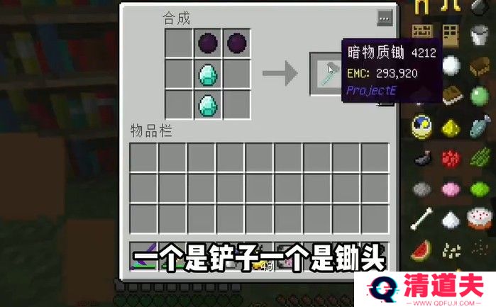 6、初始是有铲子和锄头的,我们只需要伏魔一下就行,先用两个钻石再加入暗物质,就可以打造出暗物质锄和暗物质铲。