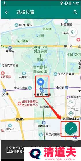 5、进入到位置选择界面后,我们随便选择一个,比如“北京”的某个区域,然后点击对号按钮进行位置确认。