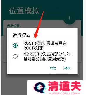 3、这时候会跳出一个选择框。根据手机权限来选择,root模式就直接点击授权就行了。免root模式需要到开发者选项中找到选择模拟位置信息应用。
