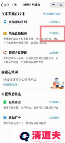 6、进入在线课堂之后,小伙伴们需要点击班级直播授课中的立即发起按钮。