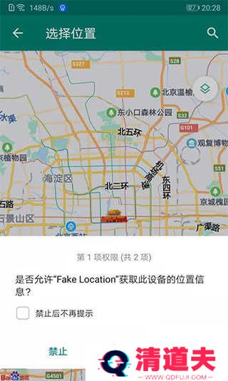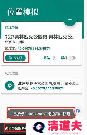 7、允许了root权限后,位置模拟就启动了,这时候系统里面的位置信息就改成了在fake location里面指定的位置了。