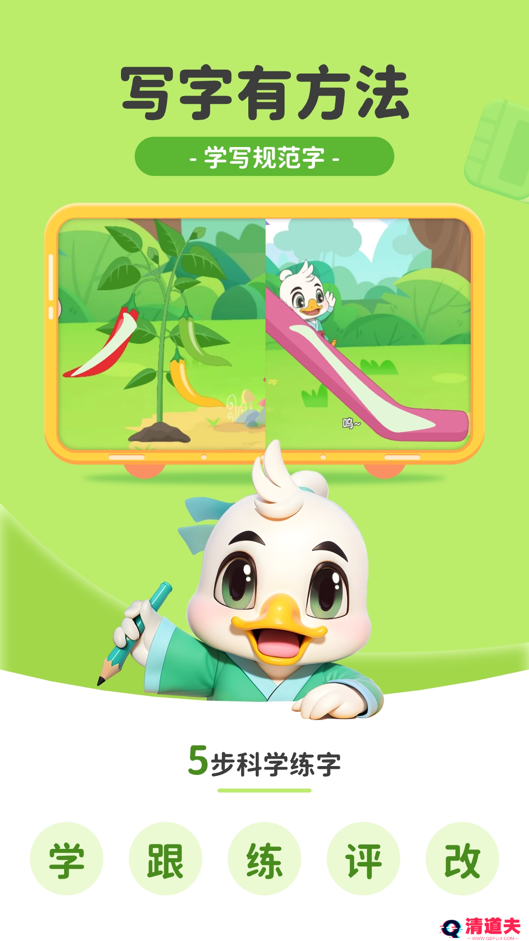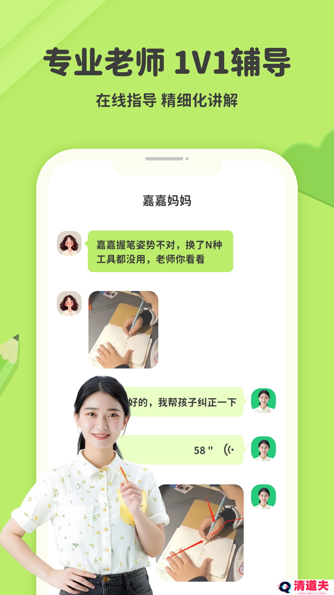 观看教学视频,一笔一笔跟写,连贯书写练习,拍照实时点评,及时纠正