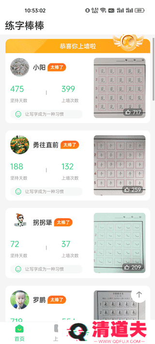 2.在首页下面还能看见其他小伙伴坚持练字的榜单,只要跟着一起坚持练字,你也可以上榜单哦!