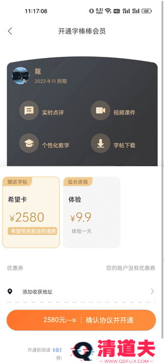 练字棒棒收费为一年2580元并送字帖,体验会员为9.9一天,开通会员后,里面的内容不再额外收费,全部免费使用,新用户登录会送一星期会员体验