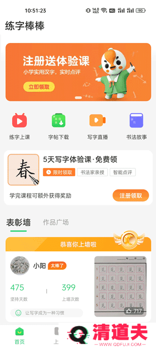 1.练字棒棒写字app是一款非常好用的软件,在首页有练字上课,字体下载,写字直播,书法故事等实用的功能