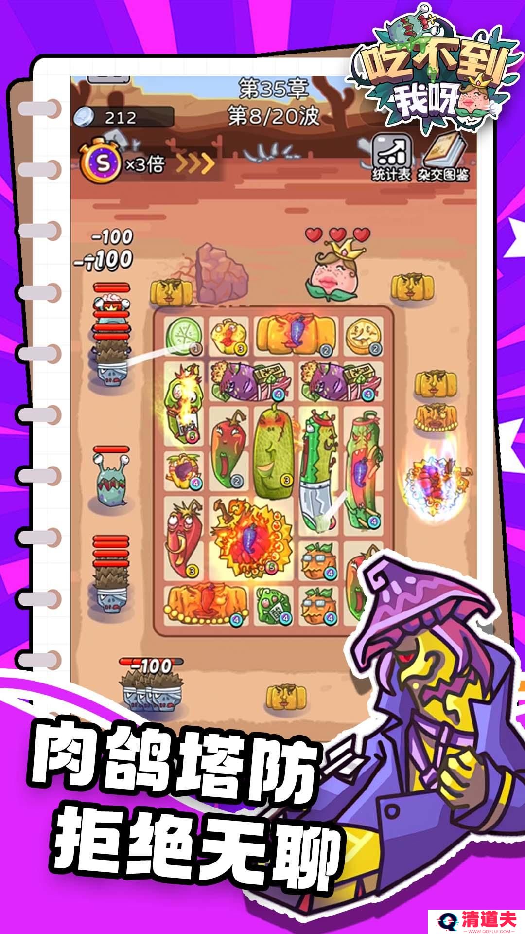 吃不到我呀最新版是一款休闲益智小游戏,游戏通过精致且具有特色的游戏风格,吸引玩家眼球;玩家通过扮演一名农夫,召唤跟多强大的植物来进行战斗,这些植物都不是我们常见的,是通过了杂交,形成不同属性的新型植物,它们具有超级强悍的战斗能力,可以进行不同的搭配来赢得战斗胜利。