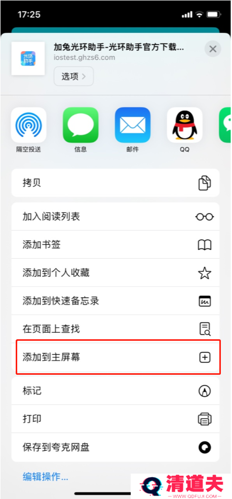 步骤三:当然如果你想要将光环助手其添加到手机桌面上,那么可以点击底部中间的“分享按钮”,箭头所指方向。