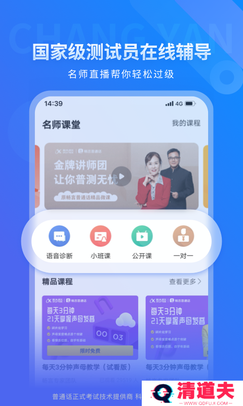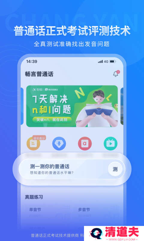 依据国家《普通话水平测试实施纲要》进行普通话模拟测试,与国家普通话水平智能测试流程高度一致,单音节字词、多音节字词、短文朗读、命题说话,面面俱到,让您在全真模拟测试环境中逐步提高普通话水平,轻松过级。