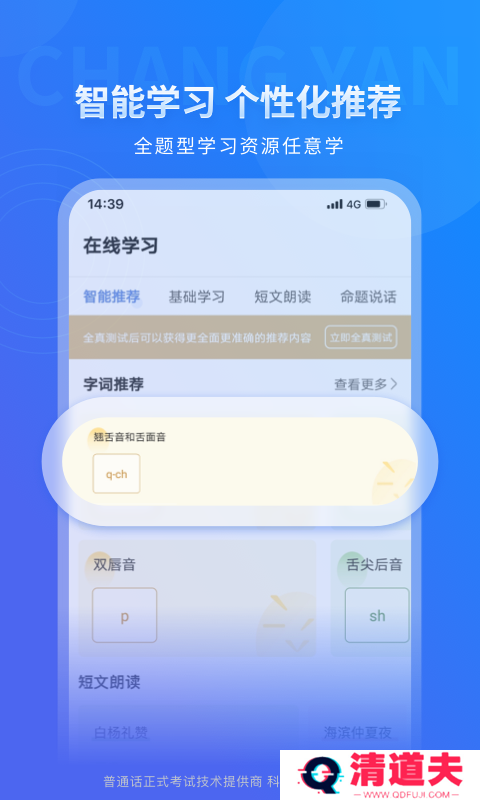 4.推荐课程:综合分析您在模拟测试和在线学习过程中存在的发音缺陷和薄弱点,为您推荐量身定制的训练课程,助您精准提高普通话发音。