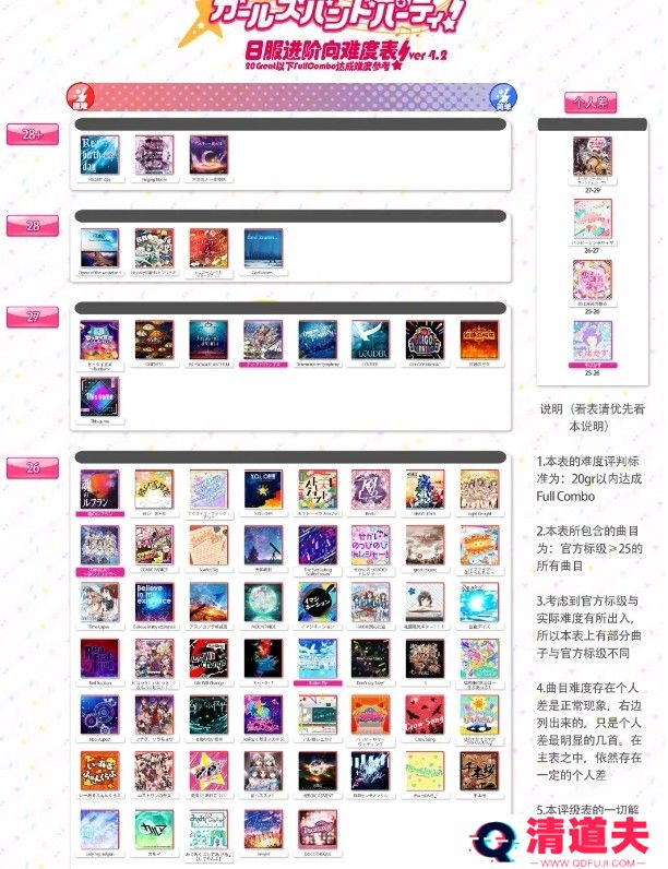 最后我发一下bangdream歌曲实际难度表,请各位大佬新人按照自己的实力打