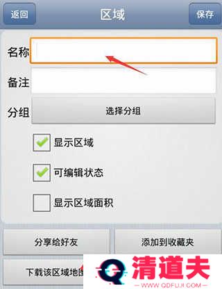 3、在地图上通过“区域”和划线功能,把从自己位置到要去地点的范围圈起来