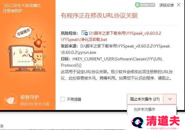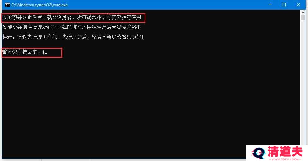 2.然后在输入"1"屏蔽并阻止后台下载YY浏览器等推荐应用;如图