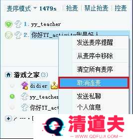 管理员通过点击受邀者右键菜单中“取消连麦”项,直接结束当前受邀者和1号麦序的连麦,如下图: