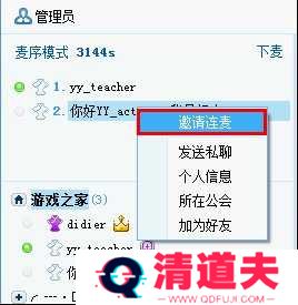 1号麦序可邀请麦序上的其他人一起连麦,通过点击受邀人的右键菜单中的“邀请连麦”项,对受邀人发送连麦邀请,如下图: