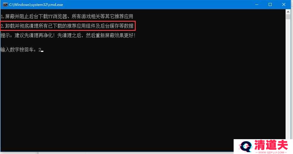 首先在弹窗中输入"2"点击回车,清理推荐的应用组件;如图