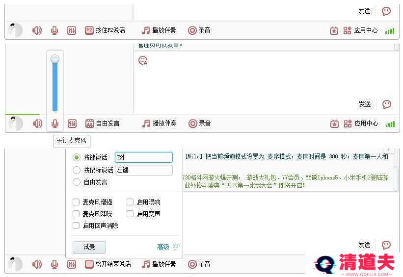 鼠标移入麦克风标志可进行说话音量调整,说话成功状态下将有绿色音量条出现。