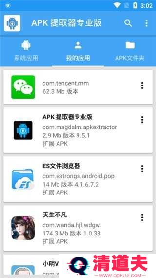 1、打开从本网站下载的最新安卓版本的APK提取器,点击在系统程序和我的应用程序中选择要提取的APK软件。