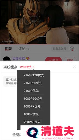 4、如果还需要选择下载视频的清晰度,可以点击【720p优先】,在弹出的下拉中选择相应的清晰度