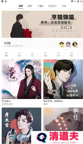 3、如果想听直播的话,点击直播,里面有海量的声优主播等着你。