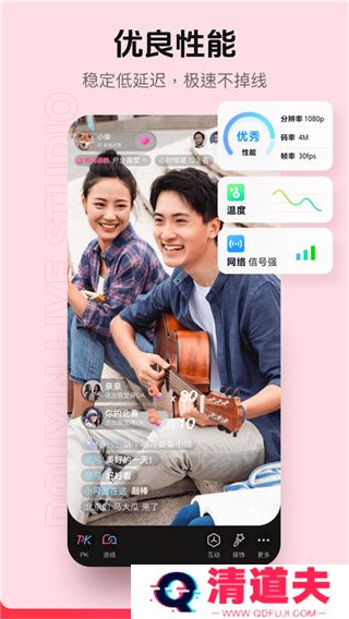 抖音直播伴侣手机版app优势抖音直播伴侣手机版app是一款十分专业的直播助手伴侣,高清的画质,还有各种动态场景也无损画质。简单的直播操控,让你可以拿起手机随时随地直播身边事。