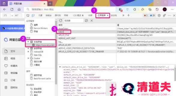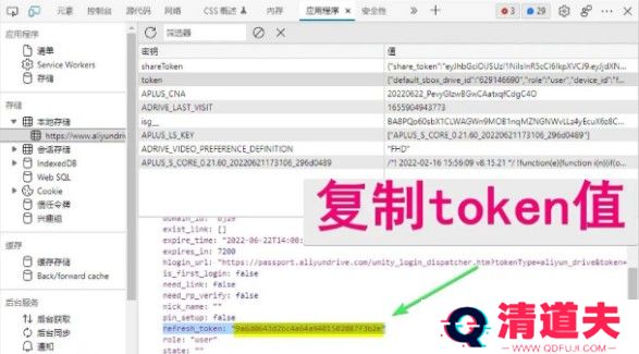 3,登录成功之后,按下键盘上的F12键 (或者ctrl + shift +i),打开‘开发人员工具’。然后,依次点开:应用程序(Application)→ 本体存储(Local Storage)→ token。点开 token 之后,找到底下的 reflash_token。在 reflash_token 后面有一串代码,那就是 token 值。