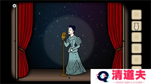 11、第一幕,幕布重新打开零字就出现了一个女人,点击他,让他一直高歌就会出现一个穿着黑色礼服,戴着眼镜的女人,再点击一下,上方就会出现四个盘子,我们把我们刚刚得到的物品放到这些盘子上,顺序是贝壳婴儿心脏和帽子再点击这个女人,他会口吐一束光,嘴里长出一朵花,我们拿到花女人就谢幕了,
