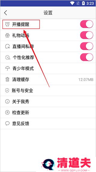 3、进入“设置”页面,找到“开播提醒”栏目。