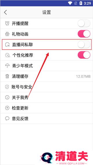 5、勾选“直播间私聊”栏目右侧按钮,向左侧滑动进行关闭。