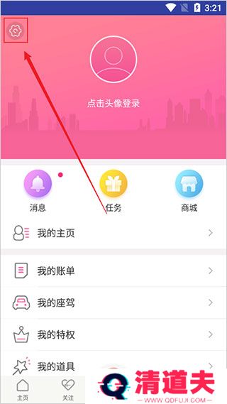 2、在“我的”页面,点击左上角“小齿轮”图标按钮。