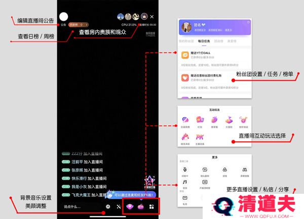 2、开播后可在主播直播界面查看直播相关信息和进行直播相关玩法: