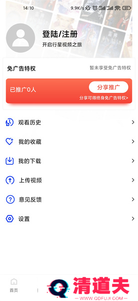 4、在我的个人中心页面,登录之后开启行星视频之旅,可以查看观看历史、我的收藏、下载到本地的视频、上传视频、反馈意见等,还能进行个性化设置。