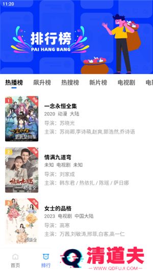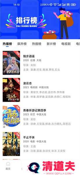 2、通过排行列表可以看到热播榜单、飙升榜、热搜榜、新片榜、电视剧、电影等分类,查看当前正在热门的电视;