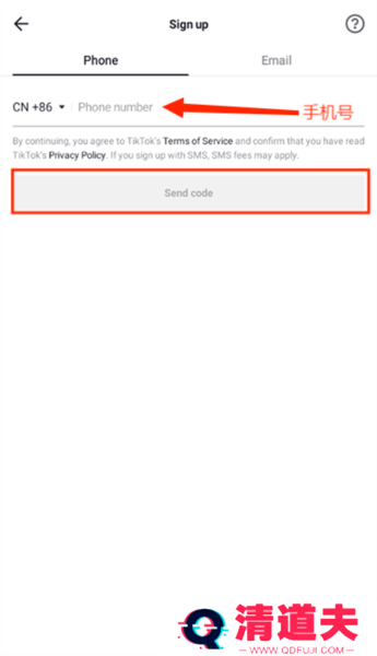 4、输入手机号码或者邮箱号,然后点击“Send code”注册。