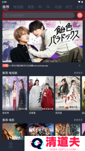 1、在豚豚剧app的“频道”页面的搜索框中,搜索自己想看的剧或者电影、综艺。