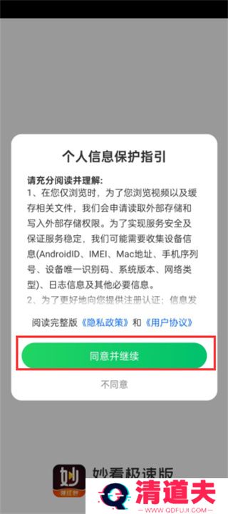 1、在本站下载并安装妙看极速版app后,点击同意并进入;