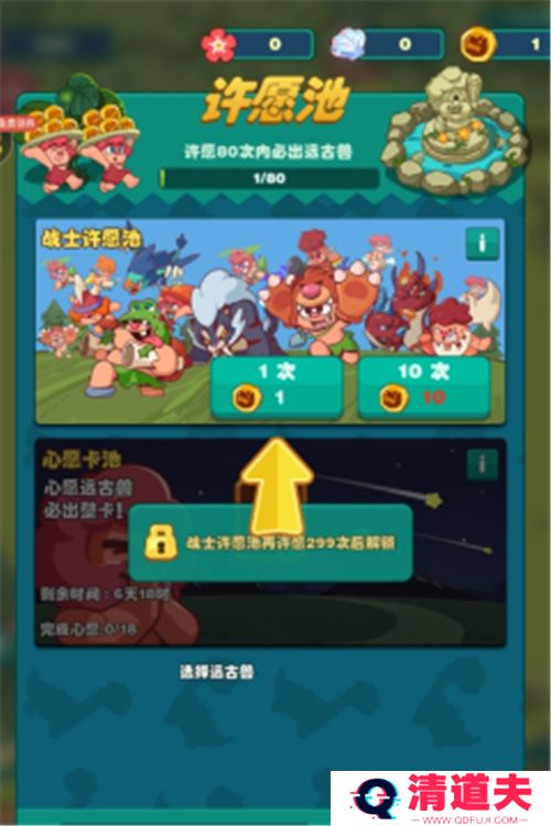 3、许愿池用于解锁新的战士或远古兽,玩家通过战斗获得的许愿币在许愿池中进行抽取。