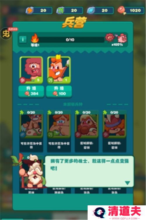 4、兵营主要用于升级战士的等级和能力,通过不同数量的食物提升战斗力,并进行升星操作。