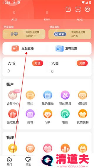 六间房秀场app怎么设置背景海报?1、进入六间房app,点击下方我的,选择发起直播;